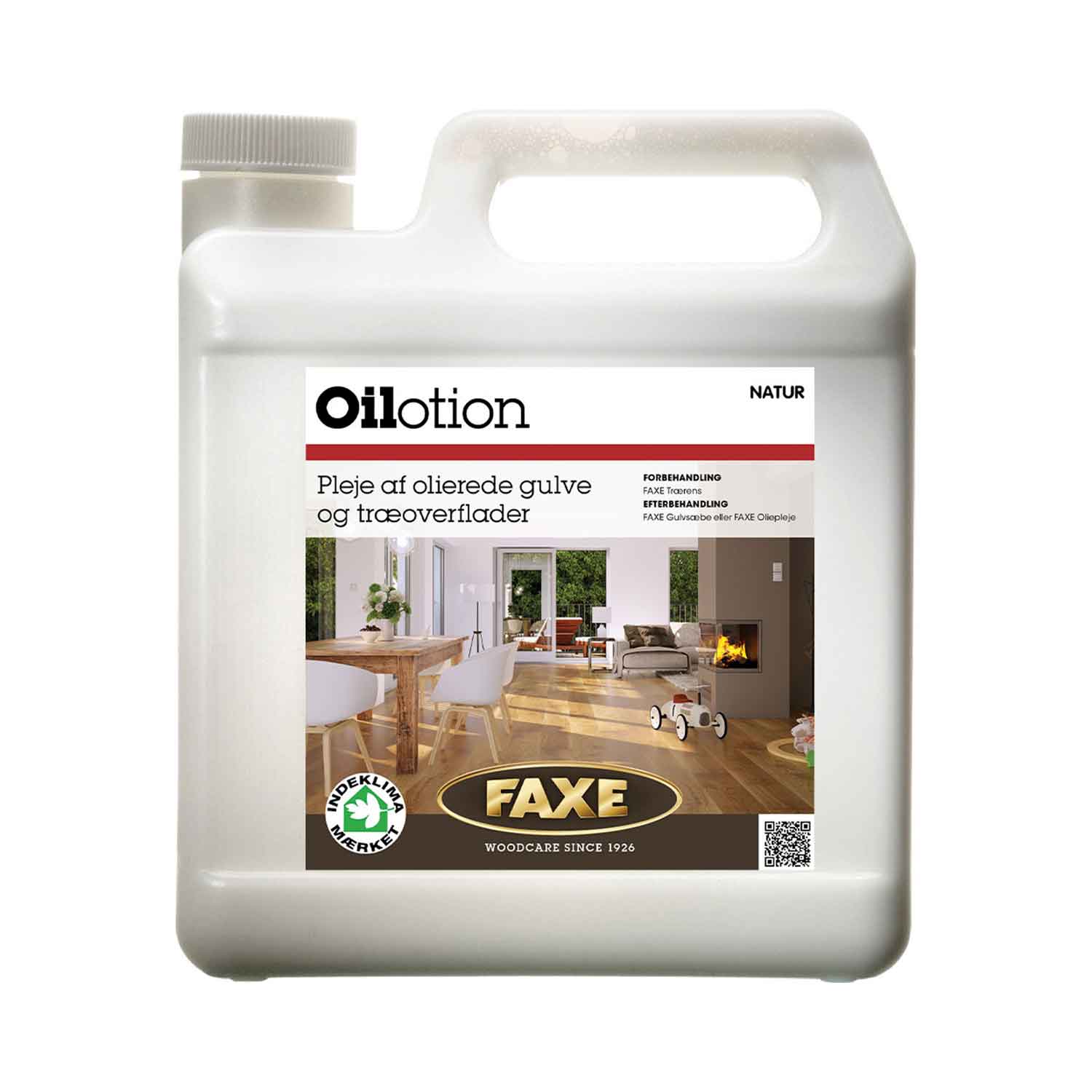 FAXE Oilotion er specielt udviklet til en nem og hurtig genopfriskning og vedligeholdelse af oliebehandlede gulve. Produktet har en hurtig tørretid og gulvet er hurtig klar til brug. FAXE Oilotion er fremstillet af vegetabilske olier og voks. FAXE Oilotion olierer og plejer træet, og giver en gennemsigtig, beskyttende og væskeafvisende film på gulvets overflade, som gør at gulvet bliver nemt at vedligeholde. På naturolierede gulve fremhæver og vedligeholder FAXE Oilotion den dybe gyldne glød, der er i træet.
